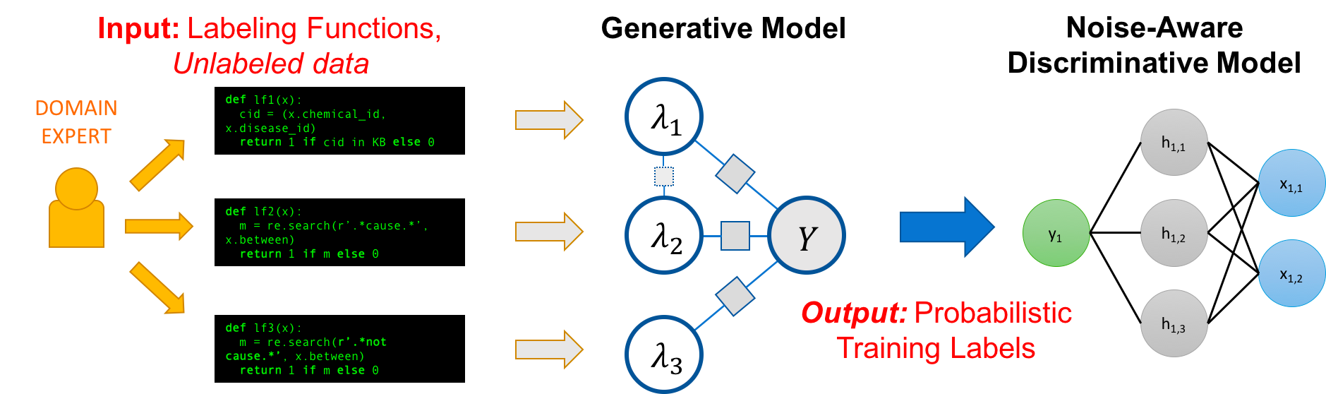 For examples like these, blindly applying your weak labeling systems might lead to problematic results, where developing a model might yield a classifier with much better generalization. This leads us to point 1: what if our function results are insufficiently accurate for developing a good classifier? Messy data leads to a messy model. But this is why weak supervision isn’t just labeling functions—it’s actually a bit smarter than that. Under the hood, weak supervision implementations will use the noisy, less accurate labeling functions to generate a probabilistic labeling model:
